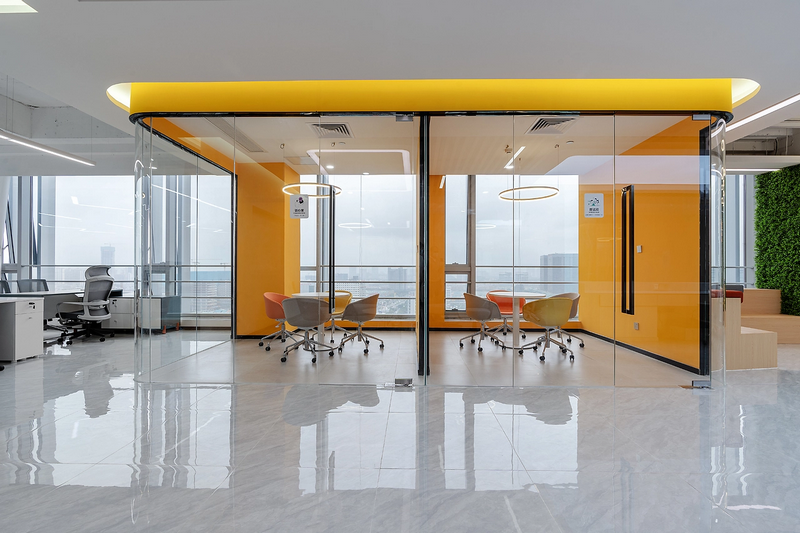 玻璃隔斷: 通透性好,采光佳,可以保持空間的通透感,適合用于需要采光和隔音的區(qū)域。